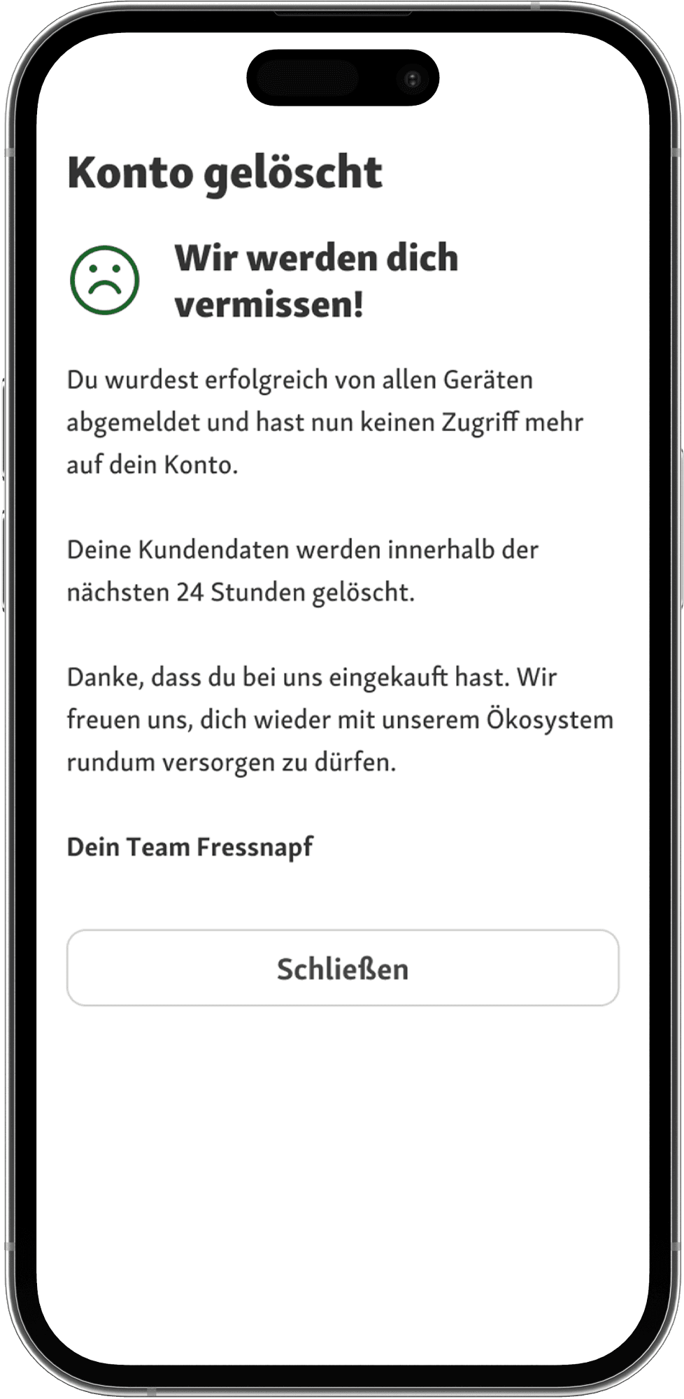 Nach Abschluss erhält der Nutzer eine Bestätigung mit persönlicher Ansprache und Information zur Datenaufbewahrung: „Deine Daten werden innerhalb von 24 Stunden gelöscht.“ Diese transparente Kommunikation stärkt Vertrauen – auch beim Abschied.